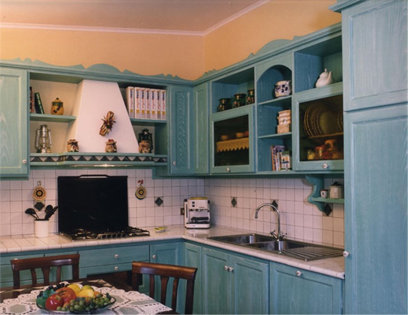 A questo punto è facile intuire che il punto di forza di una cucina decapè è rappresentato dalla tinteggiatura. Per la loro realizzazione vengono sovrapposti diversi toni di colori acrilici e, una volta che la tinta si è asciugata del tutto, si procede alla carteggiatura in unti specifici, come i lati dei pomelli, gli spigoli oppure la parte centrale dei pensili.